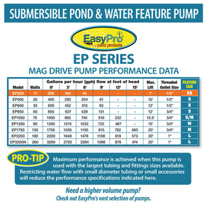 The EP Series Mag Drive Water feature pumps are specifically designed for smaller water features, small fountains, pond skimmers, back yard decorative fountains, and much more. These small yet powerful pumps are highly reliable and durable due to the presence of very few moving parts. With 9 different models to choose from, you can pick the one that best suits your needs and make your water feature look stunning with the help of EP Series Mag Drive Pumps.