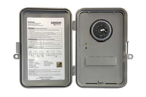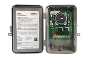 This universal residential timer uses an electromechanical time switch. The 40 amp time switch automatically detects the input voltage without the use of a DIP switch or selector pins. The time switch automatically selects any voltage between 110-277VAC.