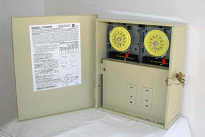 This Timing Center allows you to save time, energy, and extend the life of your Scott product.  Manufactured by Intermatic, the Timer Center contains two timers in a steel outdoor enclosure.  This timer works with either 115V or 230V units.  A great example of this is using one of Scott’s fountains on one timer and a light set on the other.  The timers are easy to set and are marked clearly with on/off levers that won’t alter your preset program.